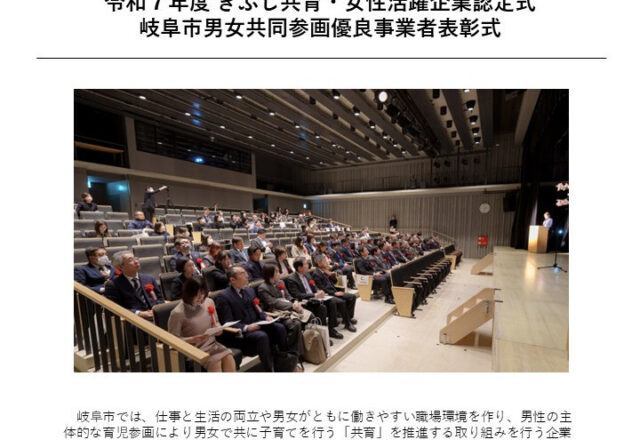 仕事と育児の両立や男女が共に働きやすい職場環境をつくり、夫婦で共に子育てを行う「共育」の推進に取り組む企業や、女性が能力を発揮して社会で活躍できる取り組みを積極的に行っている企業を「ぎふし共育・女性活躍企業」として認定するものです。